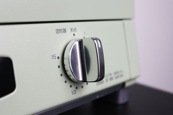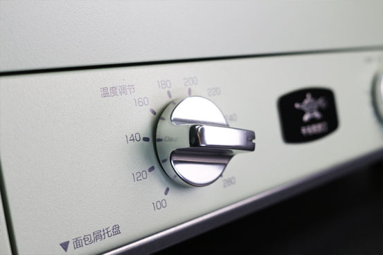 从外表到内部都是极简风格,普通家用烤箱一般设置三四个调节旋钮,千石阿拉丁只有100-280度温控以及0-15分钟时控两个旋钮,最低100度可烘焙饼干、华夫饼等,180度可烤鸡翅、280度蒸排骨、烤肠等。如果烘焙时间超过15分钟的,等结束后重新调节即可。