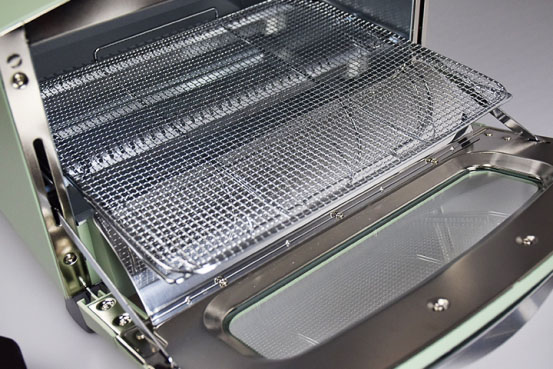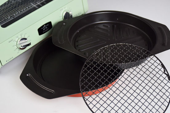 烤箱内部附赠一方形烤网、一圆形烤网(与烤盘搭配使用)、一波纹底烤盘(含油脂的肉类)、以平底烤盘(适合热蛋糕)